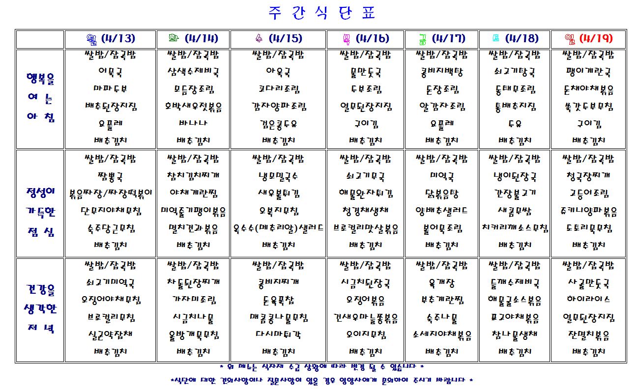 별내요양병원 2020.4.13~4.19 식단표 입니다.