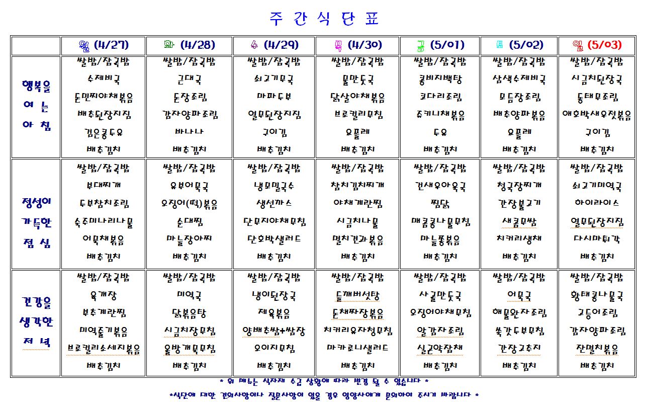 별내요양병원 2020.4.27~5.3 식단표 입니다.