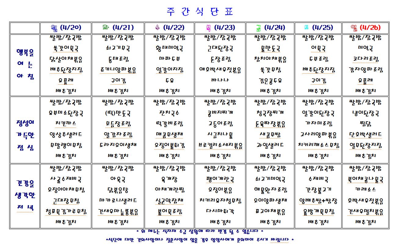 별내요양병원 2020.4.20~4.26 식단표 입니다.