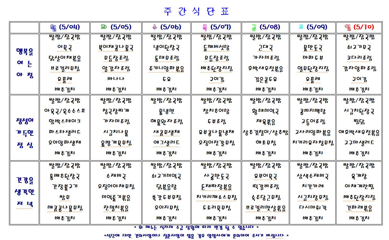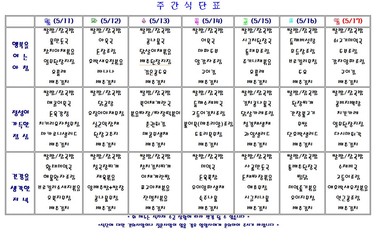 별내요양병원 2020.5.11~5.17 식단표 입니다.