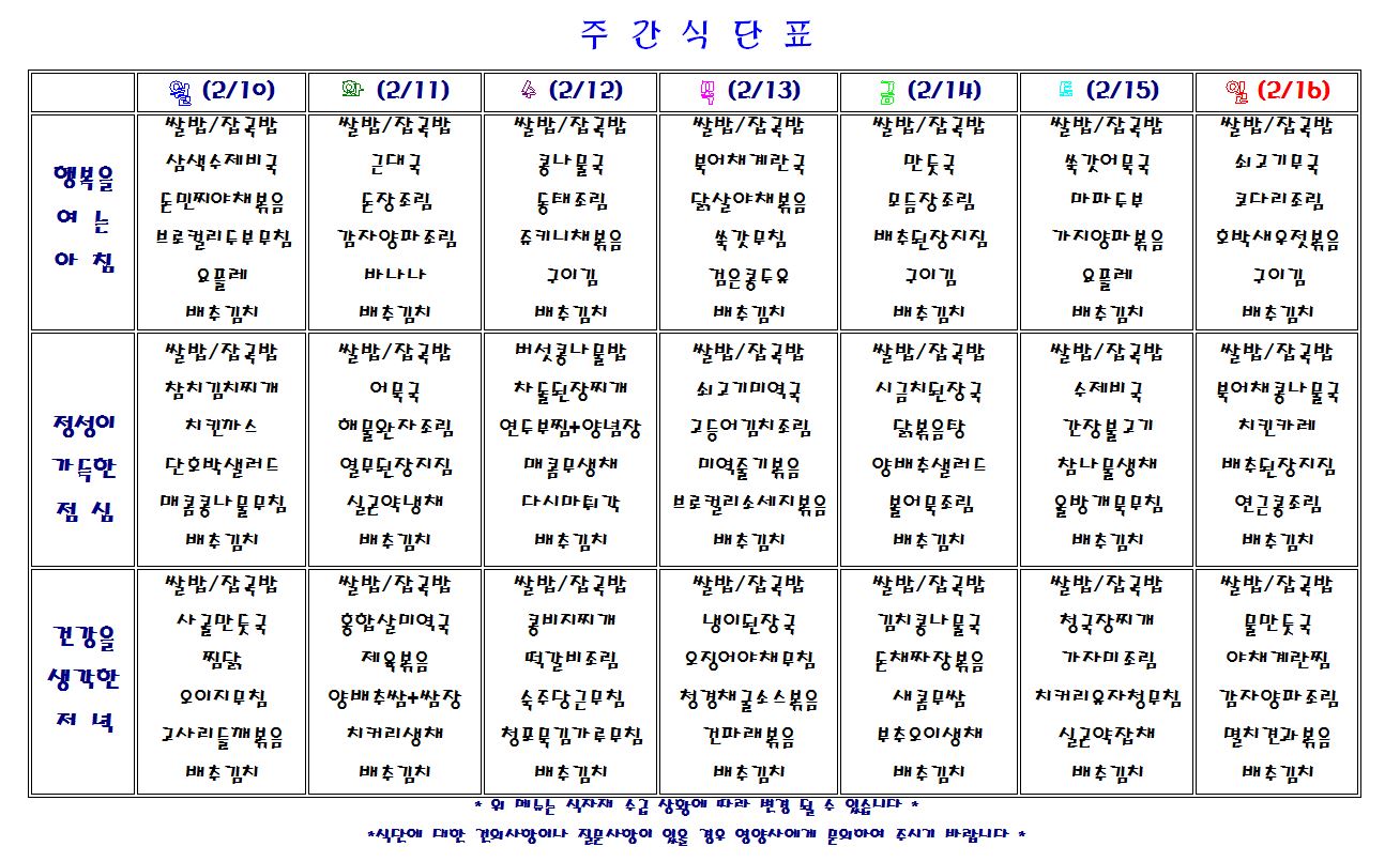 별내요양병원 2020.2.10~2.16 식단표 입니다.