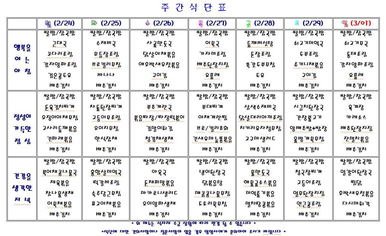별내요양병원 2020.2.24~3.1 식단표 입니다.