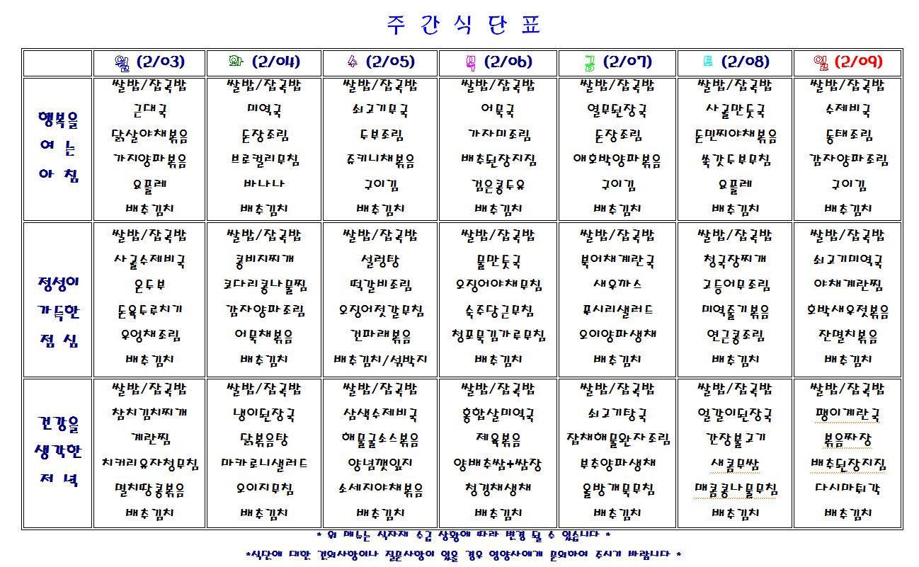 별내요양병원 2020.2.3~2.9 식단표 입니다.