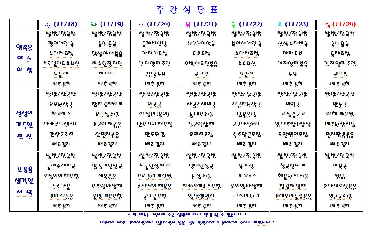 별내요양병원 2019.11.18~11.24 식단표 입니다.