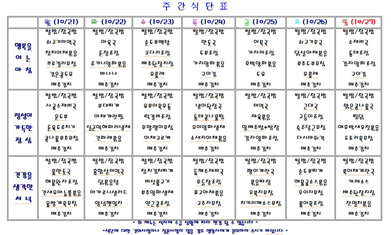 별내요양병원 2019.10.21~10.27 식단표 입니다.