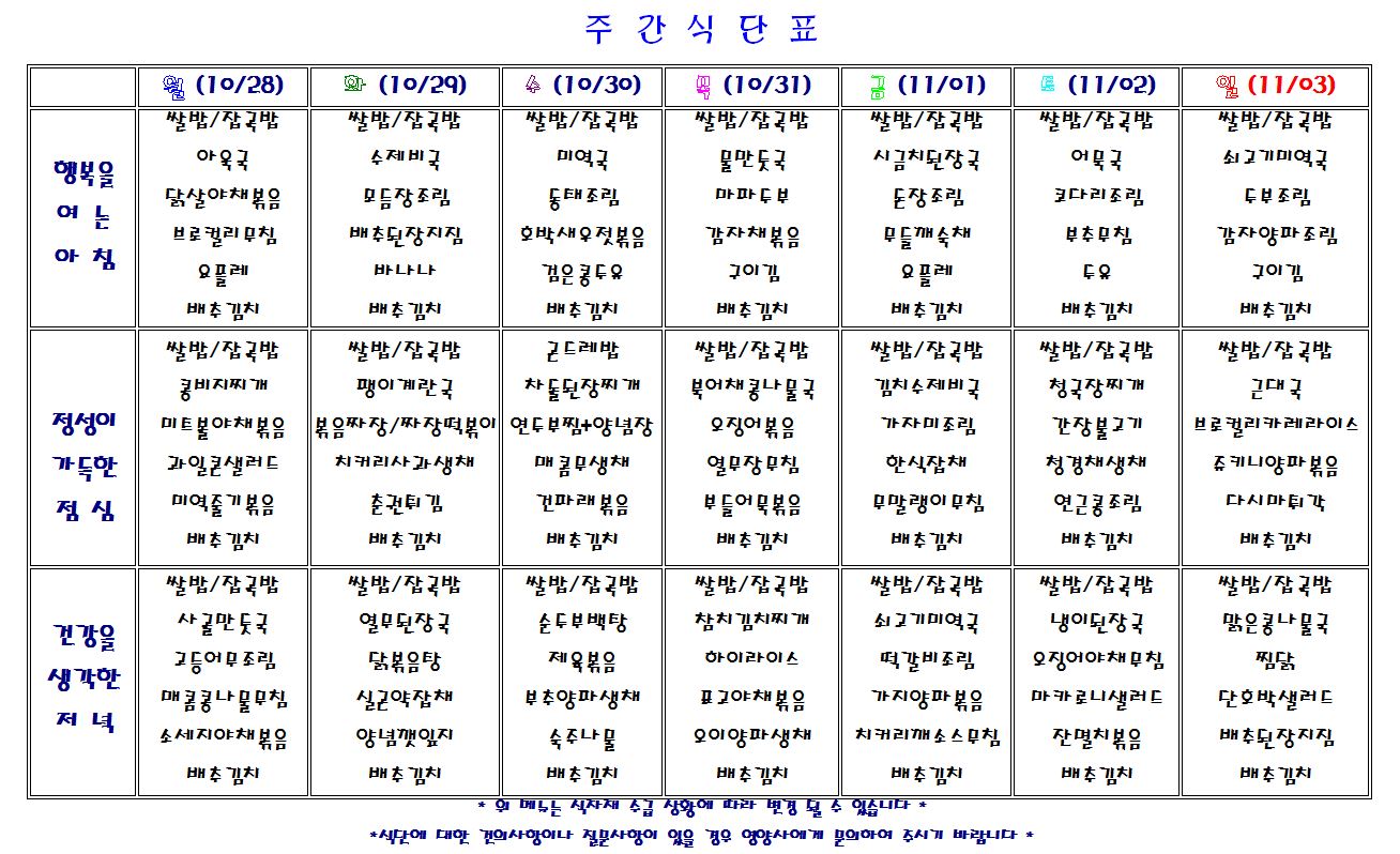 별내요양병원 2019.10.28~11.3 식단표 입니다.