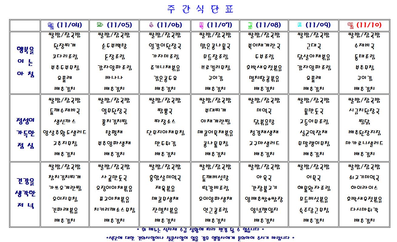 별내요양병원 2019.11.4~11.10 식단표 입니다.