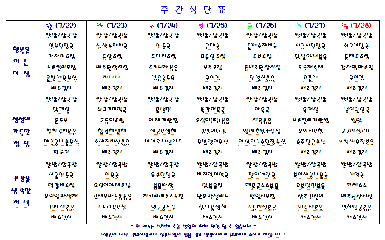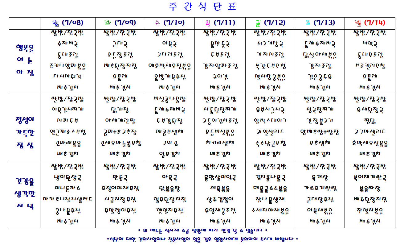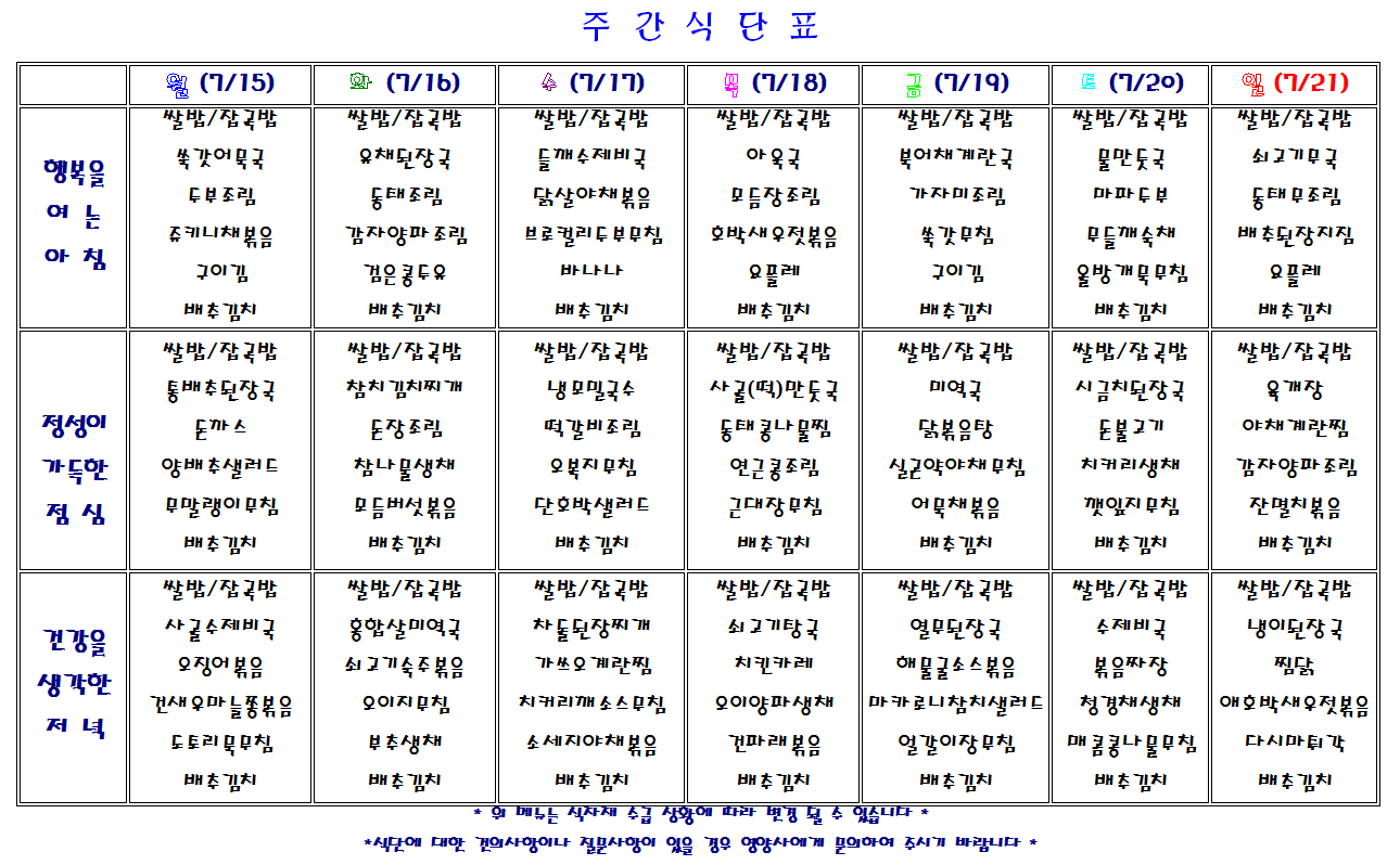 별내요양병원 2019.7.22~7.28 식단표 입니다.