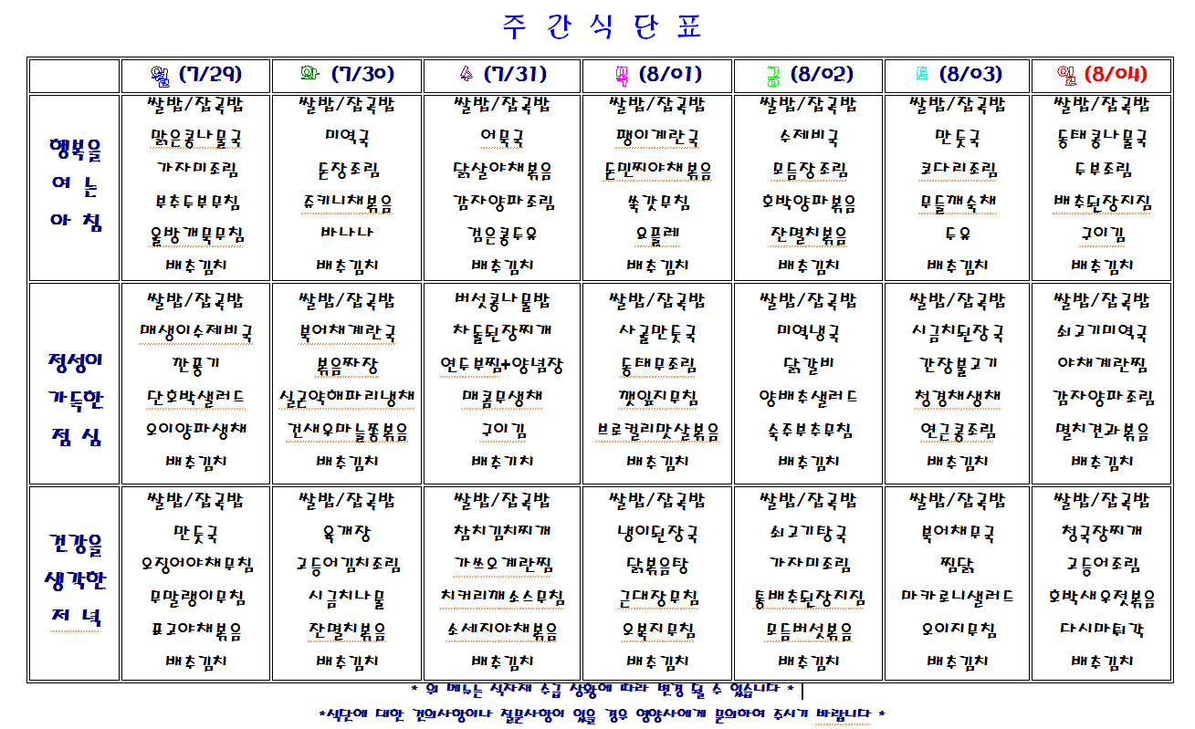 별내요양병원 2019.7.29~8.4 식단표 입니다.