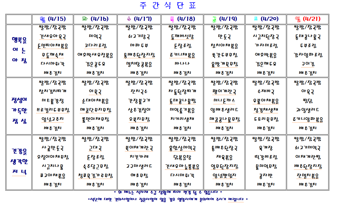 별내요양병원 2019.4.15~4.21 식단표 입니다.
