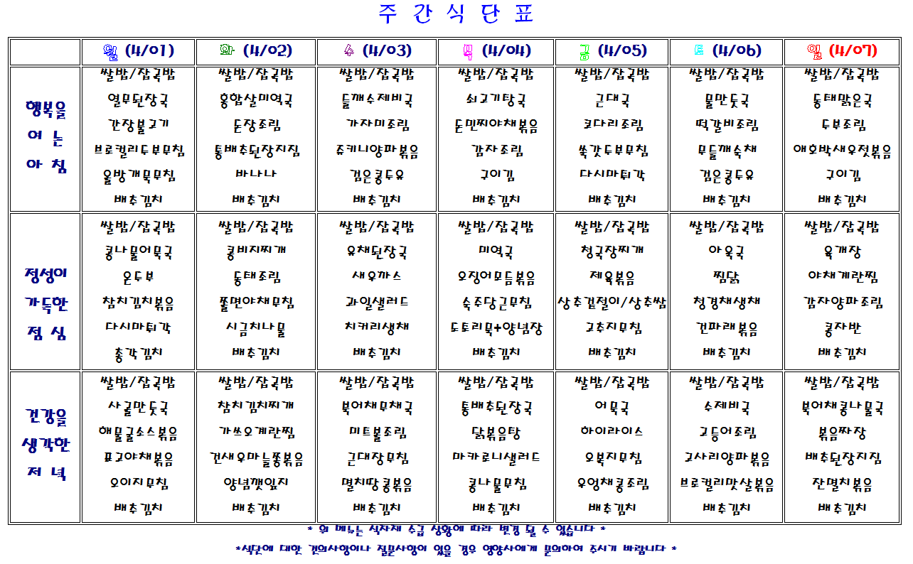 별내요양병원 2019.4.1~4.7 식단표 입니다.