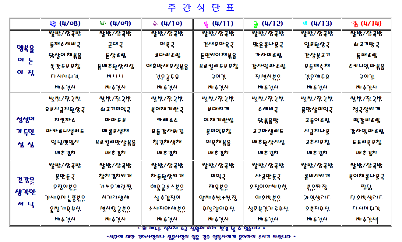 별내요양병원 2019.4.8~4.14 식단표 입니다.