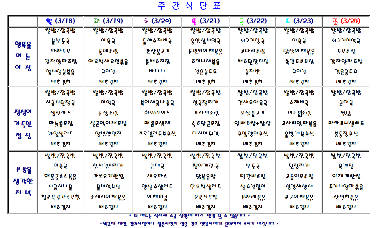 별내요양병원 2019.3.18~3.24 식단표 입니다.