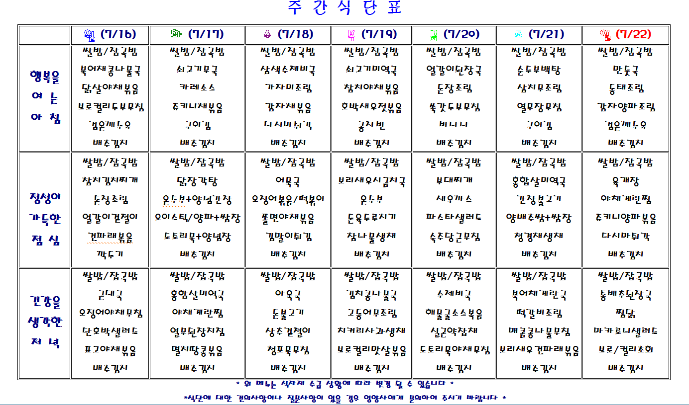 별내요양병원 2018.7.16~7.22 식단표 입니다.