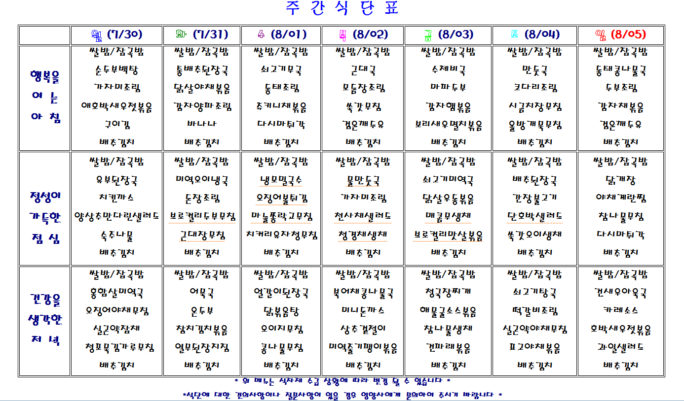 별내요양병원 2018.7.30~8.5 식단표 입니다.