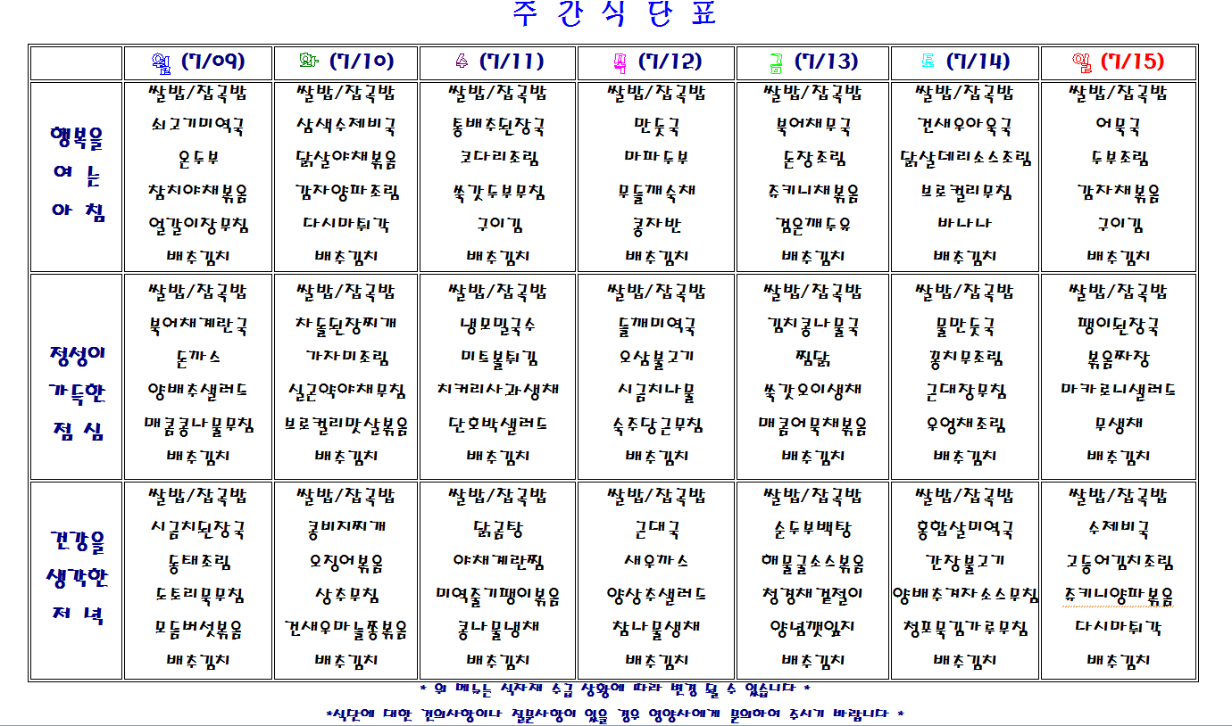 별내요양병원 2018.7.9~7.15 식단표 입니다.