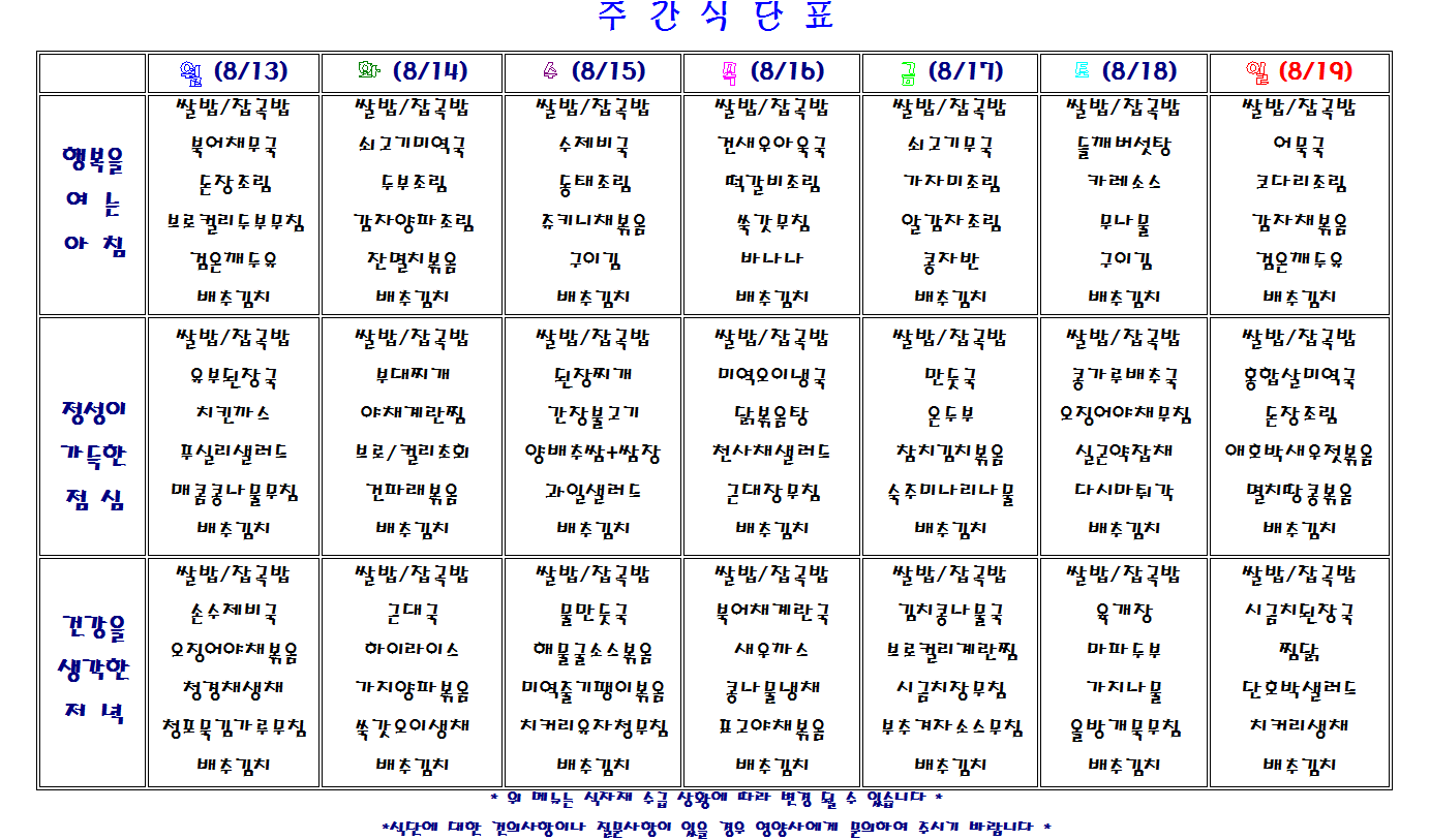 별내요양병원 2018.8.13~8.19 식단표 입니다.