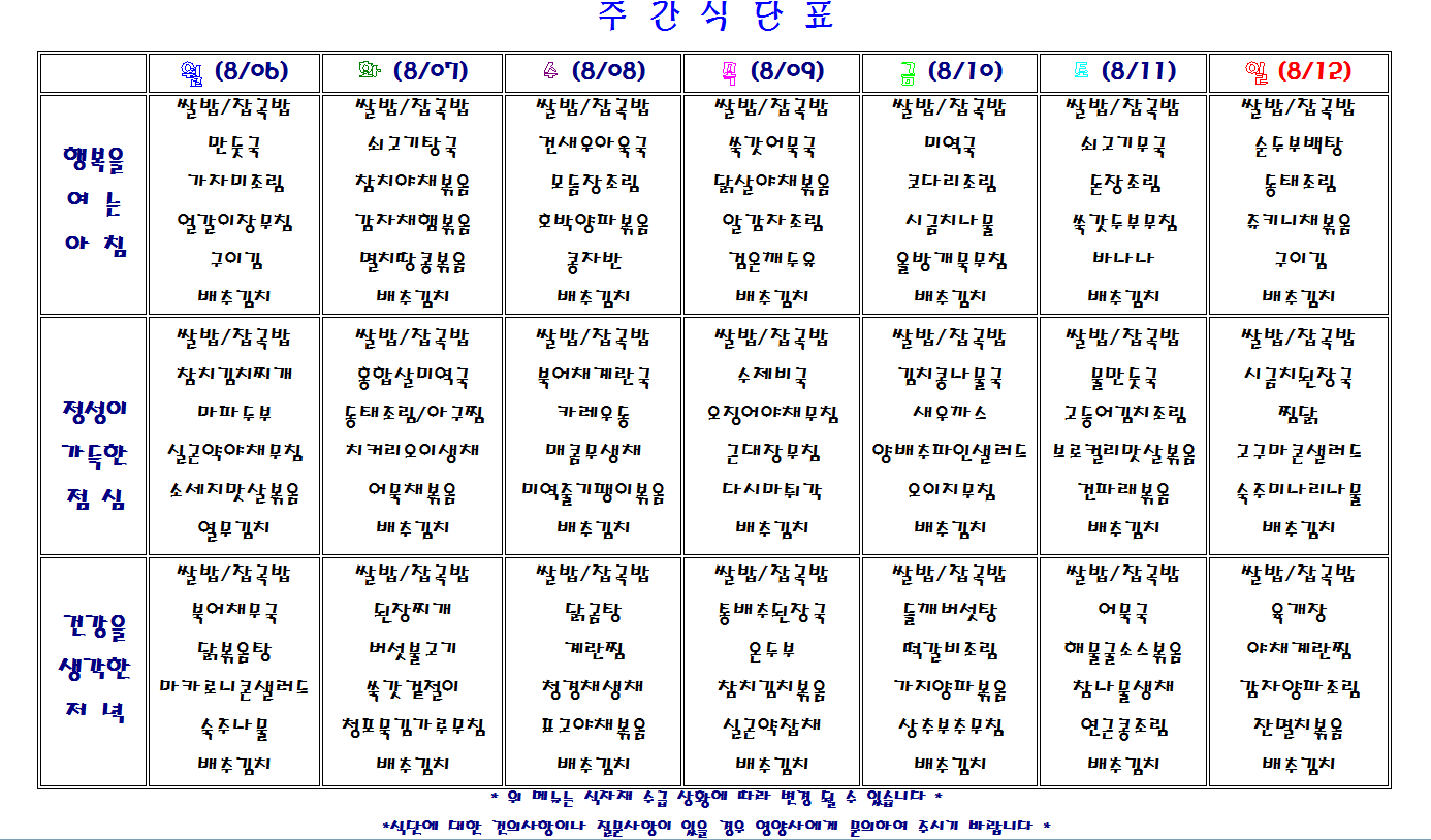 별내요양병원 2018.8.6~8.12 식단표 입니다.