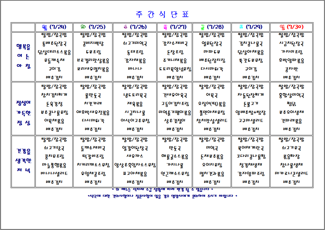 별내요양병원 2017.7.24~7.30 식단표 입니다.
