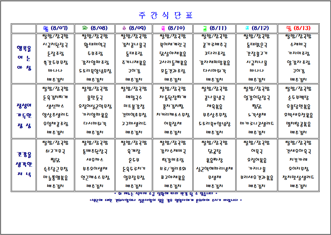 별내요양병원 2017.7.31~8.06 식단표 입니다.