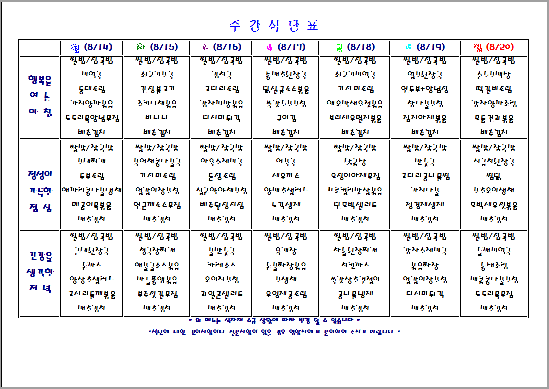 별내요양병원 2017.8.14~8.20 식단표 입니다.