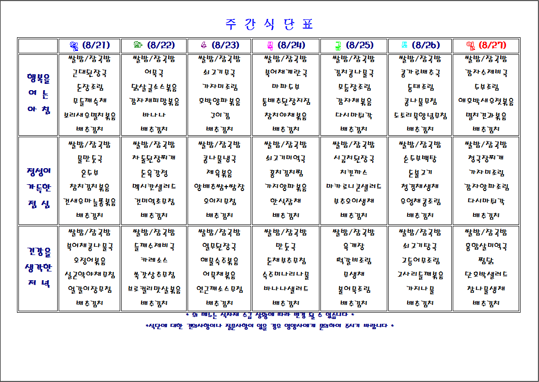 별내요양병원 2017.8.21~8.27 식단표 입니다.