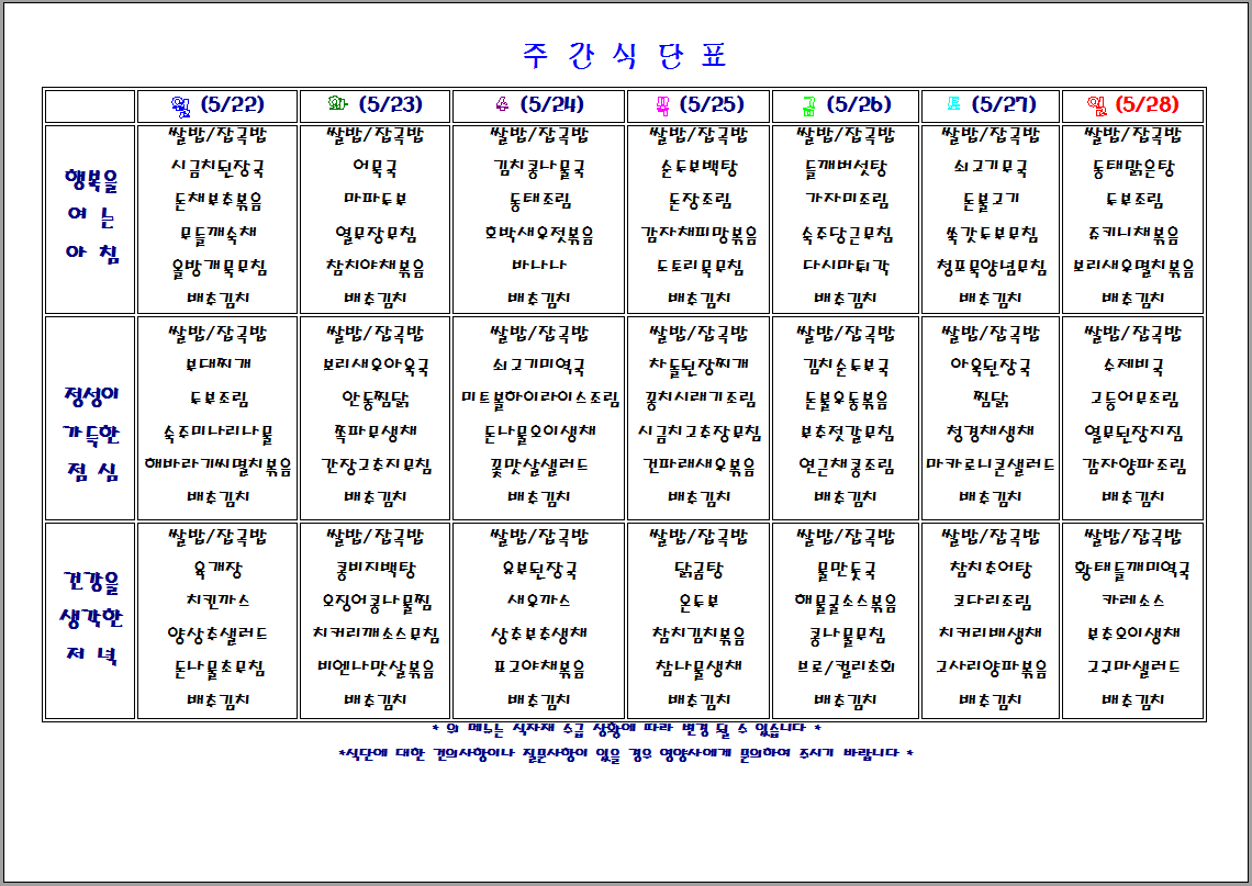 별내요양병원 2017.5.22~5.28 식단표 입니다.