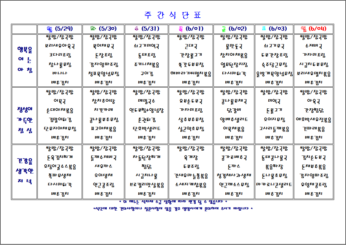 별내요양병원 2017.5.29~6.4 식단표 입니다.