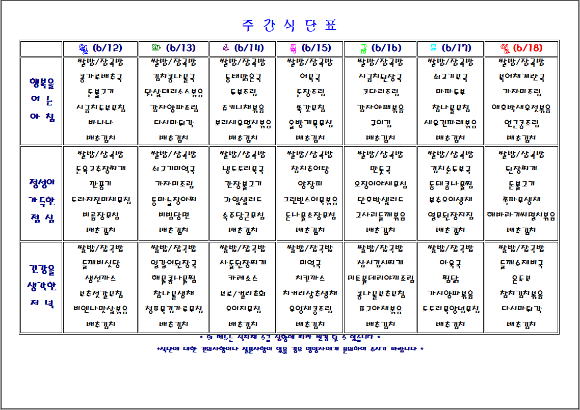 별내요양병원 2017.6.12~6.18 식단표 입니다.