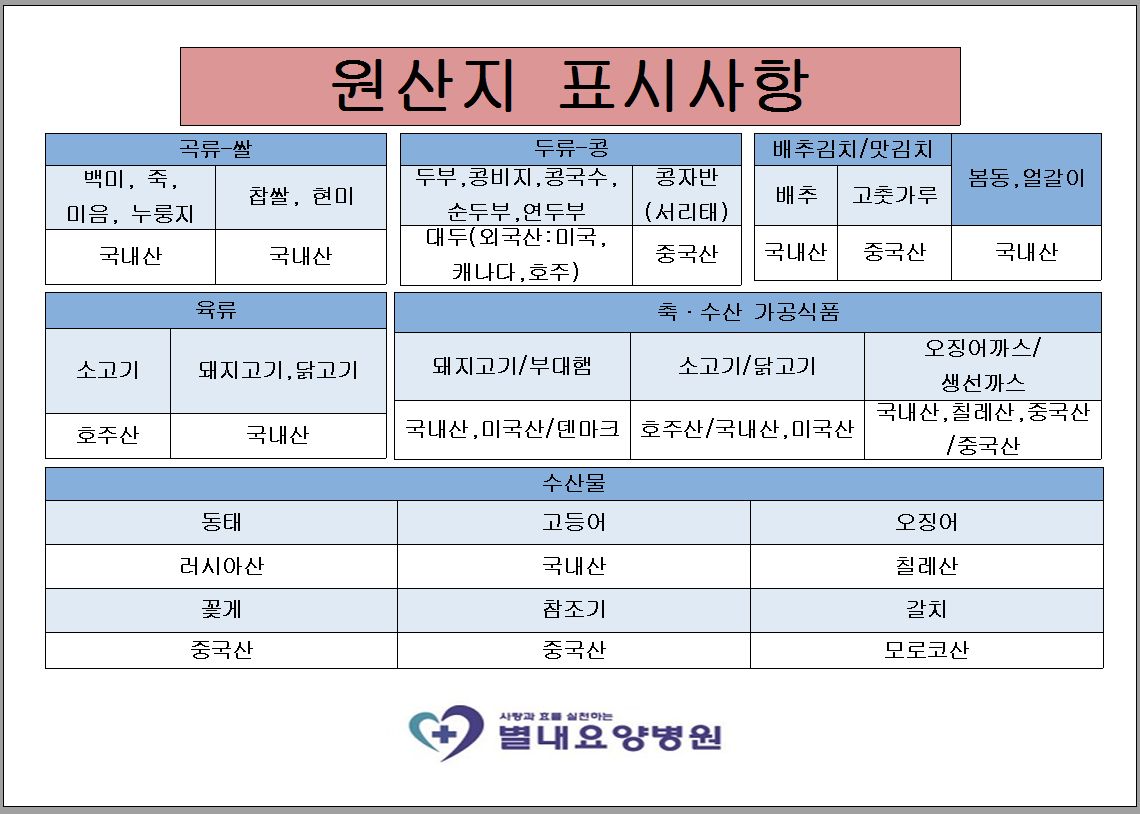 별내요양병원에서 사용하고 있는 식자재 원산지 표시사항 입니다.